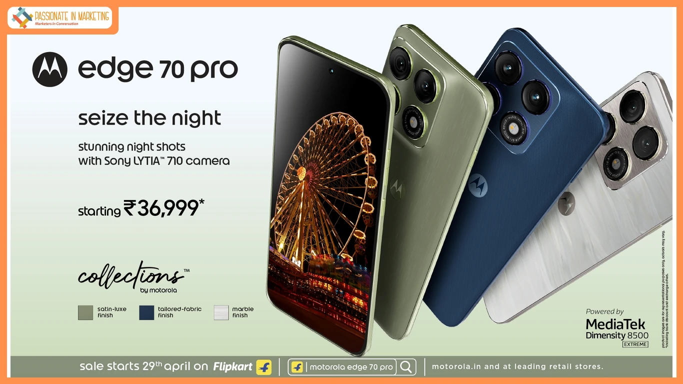 Mumbai, 23rd April 2026: Motorola, a global leader in mobile technology and innovation and India’s leading~ AI smartphone brand, today launched the motorola edge 70 pro, designed to help users Seize the Night with advanced low-light photography, immersive visuals, and next-gen on-device AI. The device features a Triple 50MP Pro-Grade Camera System led by the advanced Sony-LYTIA™ 710 camera with motoAI, delivering stunning night photography, superior low-light clarity, blur-free shots, Pantone™ Validated True Colours and SkinTone™ accuracy, along with 4K 60FPS video across all cameras. Powered by the MediaTek Dimensity 8500 Extreme, it further enhances low-light imaging with advanced on-device AI processing. The motorola edge 70 pro also introduces the all-new Collections by Motorola design featuring luxurious Satin-Luxe, Tailored Fabric, and Marble finishes in Pantone™ curated colours, paired with a stunning up to 144Hz 1.5K True Colour™ Quad-Curved Pantone™ Validated Extreme AMOLED display. Backed by a massive 6500mAh silicon-carbon battery with 90W TurboPower™ charging and IP68 + IP69 durability, it delivers a true flagship-grade smartphone experience.
