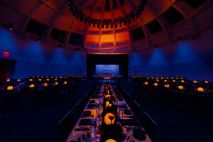 Within the minimalist space inside, views of the water were visible either side, enlivening the call of the ocean that drives the Planet Ocean campaign. From the very beginning, guests were immersed in OMEGA’s ocean world, with marine reflections projected onto walls, along with a blue and orange colour theme to match the choices of the timepiece collection. A full display of Planet Ocean models was placed at the centre of the celebration, allowing everyone to explore the new creations in detail.